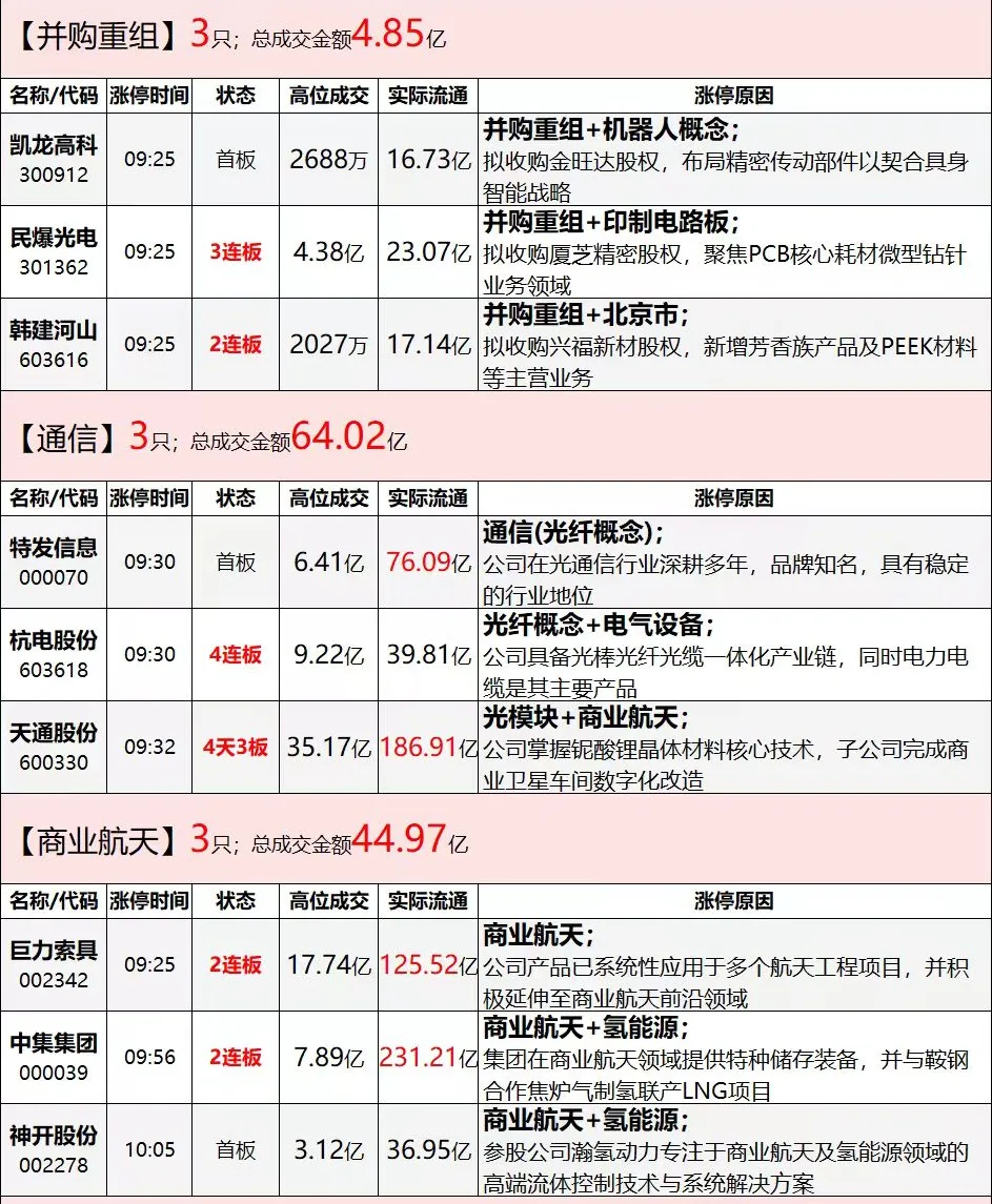 连板生态:今日全市场共68股涨停,连板股总数13只,19股封板未遂,封板率为78%(不含ST股、退市股)。焦点股方面,商业航天概念股巨力索具11天6板,油气板块洲际油气11天6板,名雕股份、杭电股份晋级4连板,并购重组的民爆光电20CM3连板。