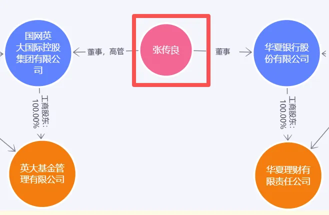 比如华夏理财和英大基金是关联方,仅仅因为华夏银行的母公司和英大基金母公司有一位共同的董事张传良。其中华夏理财实控人是华夏银行,因为董事关系国网英大国际受华夏银行重大影响(上图红色方框)。最后英大基金属于英大国际100%控股。