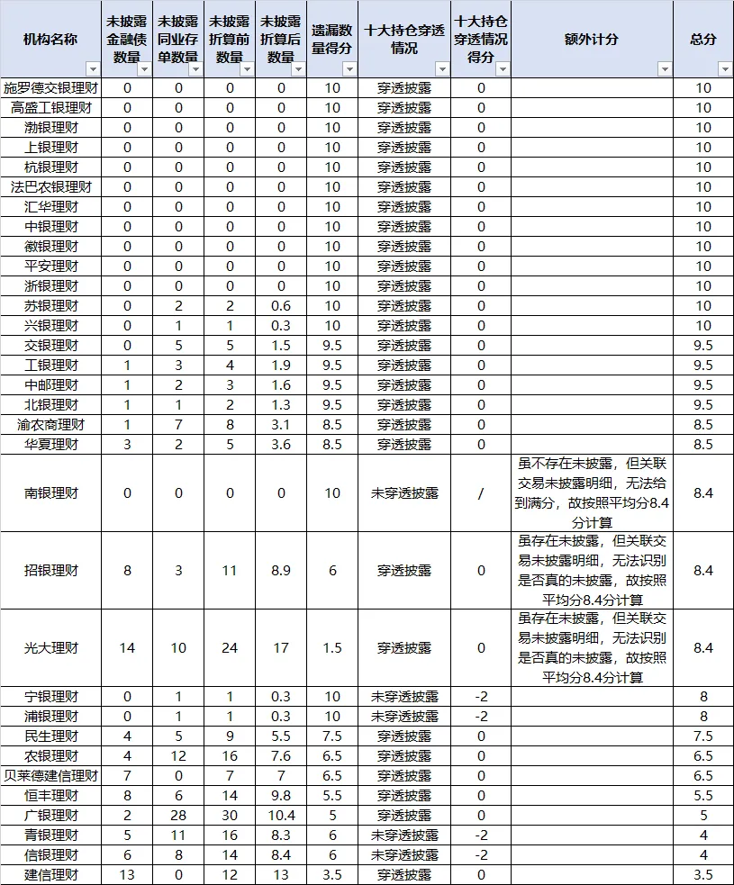 还有另外四家理财公司十大持仓未穿透披露,故额外扣2分。