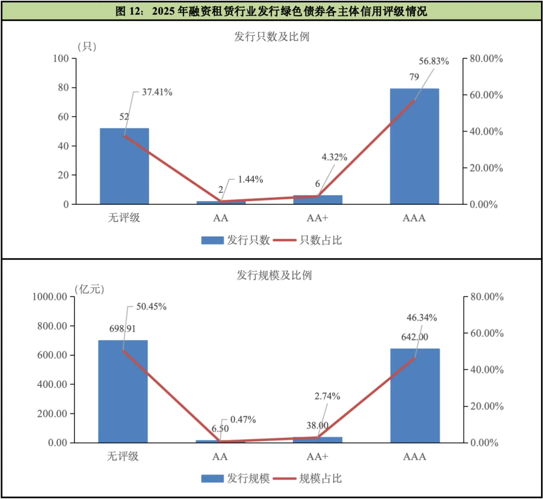 从评级主体来看,2025年国内融资租赁行业绿色债券发行市场呈现显著的信用结构上移与层次多元化趋势。2025年度,在发行规模上,融资租赁行业绿色债券的发行人仍以无评级发行主体为主(规模698.91亿元,占比50.45%),但相较2024年度同比下降21.96%,反映出在监管强化与市场自律背景下,发行主体日益重视通过公开评级提升信息透明度与市场认可度。与此同时,融资租赁行业高评级主体扩容尤为明显:2025年AAA级发行主体参与度提升明显,发行的绿色债券发行只数和发行规模分别占该行业绿色债券总发行只数和发行规模的56.83%和46.34%,分别较2024年度同比增长41.07%和64.07%;2025年AA+级主体发行绿色债券的只数及规模均较2024年明显增长,发行只数同比增长100.00%,发行规模同比增长261.90%,主要得益于高评级债券更受长期稳健资金青睐,形成发行成本与市场认可度的良性循环;此外,2025年融资租赁行业绿债市场首次出现2只AA级主体发行的绿色债券,发行规模为6.50亿元,体现出绿色债券评估体系的日趋完善,在关注主体信用的同时,推动发行主体层级进一步丰富。