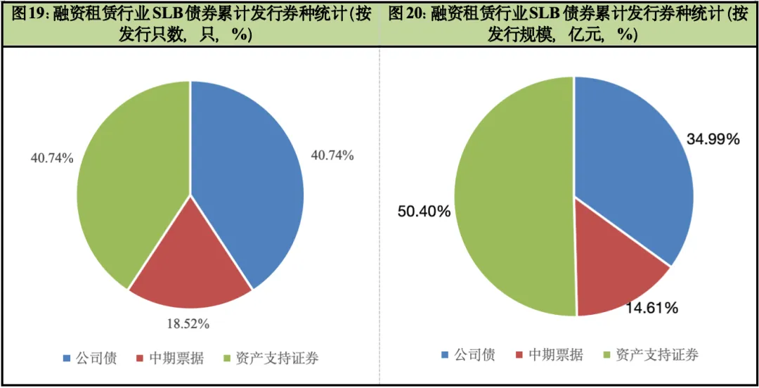 从券种来看,融资租赁行业累计发行的27只SLB债券主要为资产支持证券、公司债和中期票据三大类,其中资产支持证券的发展势头最猛。截至2025年末,资产支持证券为融资租赁行业主要发行的SLB券种,其发行规模占融资租赁行业SLB发行总规模的比例最高,为50.40%;其次为公司债,其发行规模占比34.99%,发行只数与资产支持证券一致,均为11只,占融资租赁行业SLB发行总只数的比例均为40.74%;中期票据位列第三,发行只数与发行规模占比均最少,分别为18.52%和14.61%。