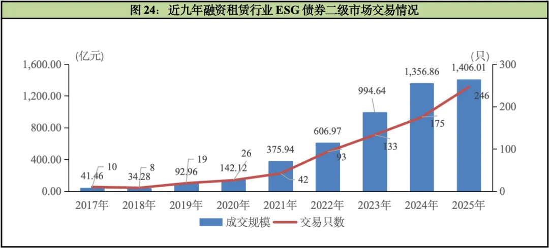2017年~2025年,融资租赁行业ESG债券的二级市场交易只数及成交规模均呈逐年上升趋势,其中2021~2025年间增长显著,并于2025年达到历史最高。2025年为近九年融资租赁行业ESG债券二级市场交易量增速最快的一年,融资租赁行业ESG债券共246只参与交投,年度现券交易规模为1,406.01亿元,交易只数和成交规模较2024年同比分别增长40.57%和3.62%。