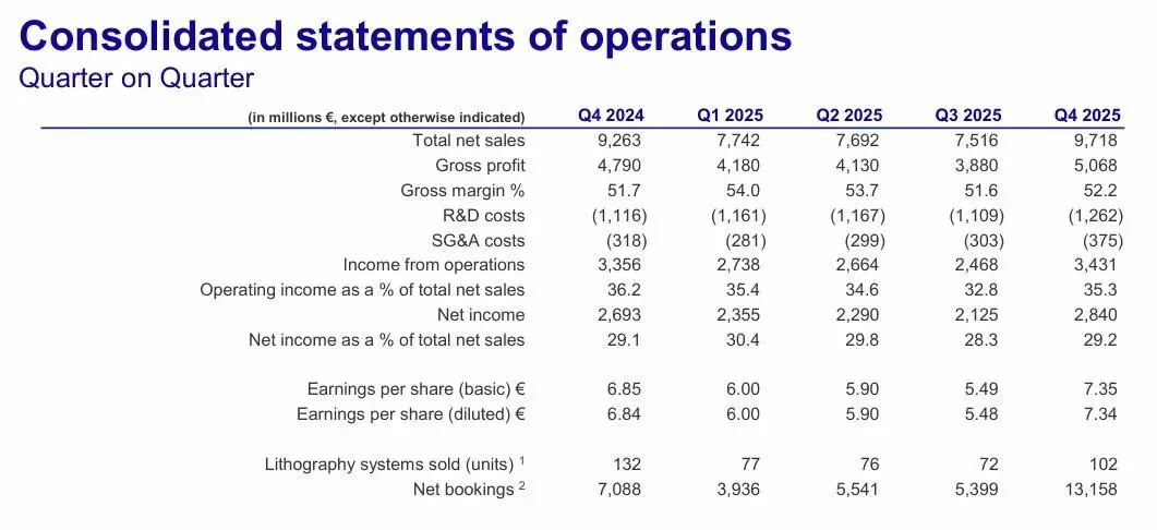 这一增长在设备巨头的财报中得到充分印证:ASML 2025年第四季度净销售额达97.2亿欧元,同比增长4.92%;泛林集团全年营收突破206亿美元,同比增长27%,毛利率创下49.9%的历史新高;科磊与DISCO同样交出亮眼成绩,分别实现超预期的营收增长与创纪录的单季表现。
