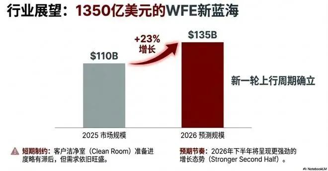 产能紧张态势在交付端持续加剧。ASML正逐季提升EUV产能,具备年产90台EUV设备的潜力;泛林集团过去四年已将近制造能力翻倍,以承接跨年排产的订单。短期来看,受洁净室空间短缺这一行业最大瓶颈影响,设备交付将呈现“下半年更强”的节奏,这反而拉长了设备需求的释放周期,避免了行业快速进入周期下行。