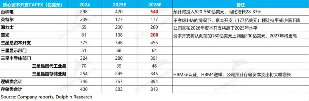 下游旺盛的需求正迅速传导至资本开支层面,形成晶圆厂与存储厂齐扩产的行业盛况。2026年,核心厂商的投资规模再创新高:台积电资本开支大幅提升至520-560亿美元,同比增长28%-37%,重点投向2nm先进制程与CoWoS先进封装;存储侧扩产更为迅猛,美光将资本开支上调至200亿美元,三星存储业务更达345亿美元。总体来看,逻辑类厂商资本开支增速预计达18%,而存储类厂商增速接近40%,形成存储领跑、逻辑跟进的格局。
