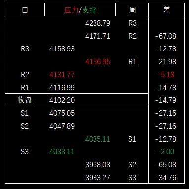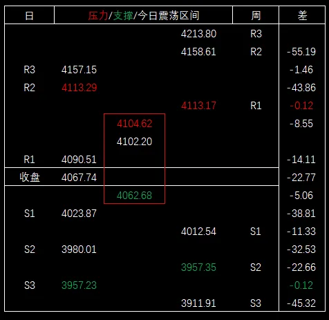 今天大盘最高4104.62,毗邻压力区间,比区间下沿(周第一压力位)4113.17低8.55,比日第一压力位4090.51高14.11。