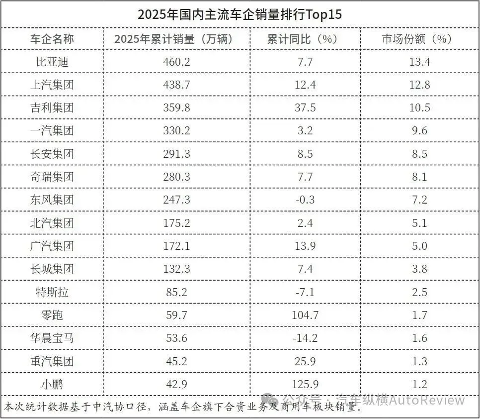2026年1月14日,中国汽车工业协会(以下简称“中汽协会”)发布了2025年全年汽车产销数据及行业经济运行情况。数据显示,2025年,我国国内车市全年产销量双双突破3400万辆,连续17年稳居全球第一,行业整体保持稳健增长。而伴随产销数据出炉,2025年国内主流车企的总销量(含商用车)、新能源和出口排名也均已尘埃落定,《汽车纵横》记者基于中汽协会数据,对全年主流车企销量表现进行了详细梳理。