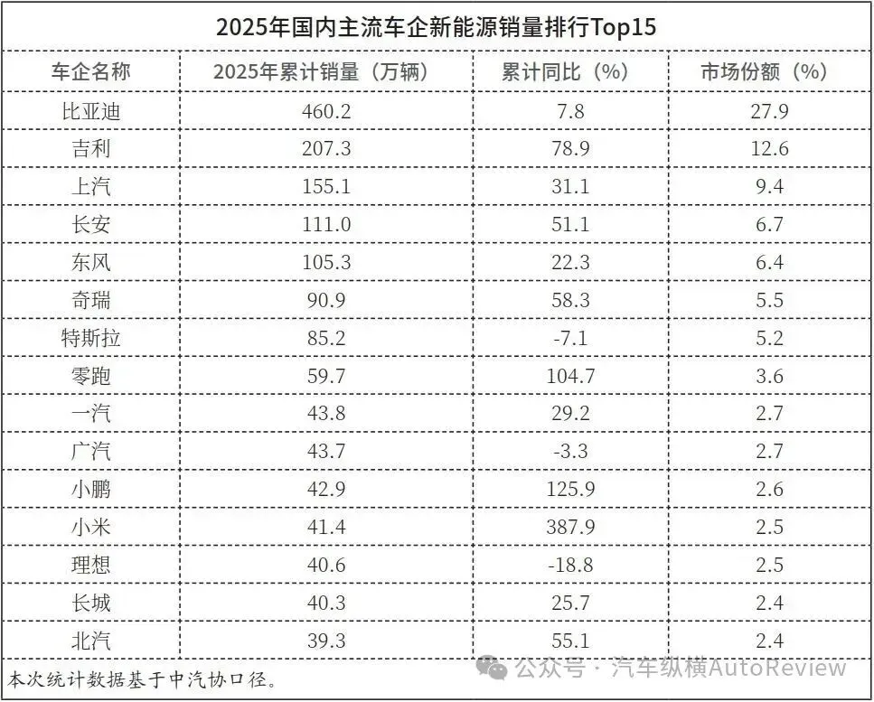 从细分榜单来看,新能源市场头部效应显著,比亚迪以27.9%的市场份额稳居榜首,虽同比增速放缓至7.8%,但凭借全品类产品覆盖仍牢牢掌控市场主导权。吉利、上汽、长安等自主头部企业新能源业务同样增速迅猛,成为集团销量增长的又一核心,而前文未提及的小米、理想两家车企,则呈现出截然不同的发展态势,成为2025年新能源市场的重要变量。