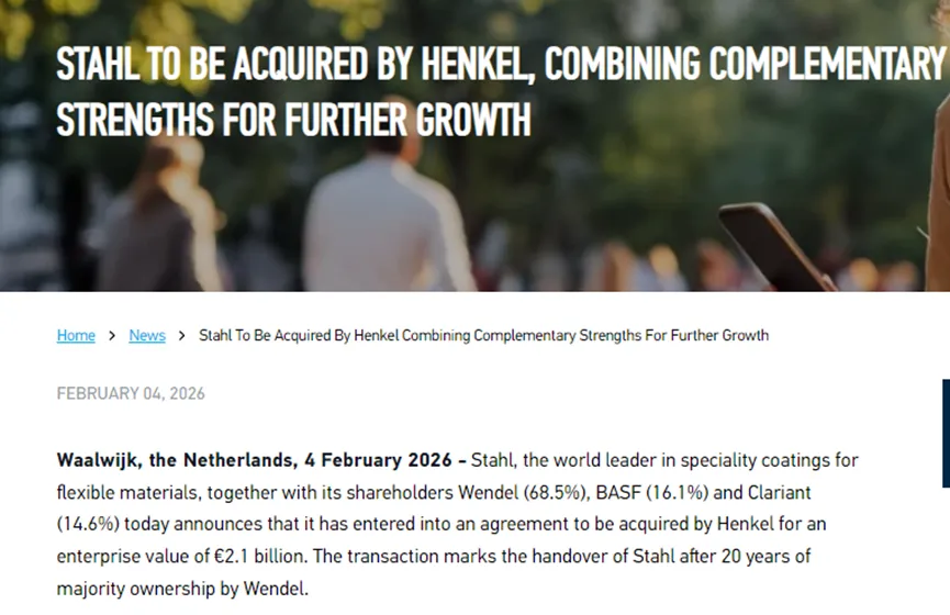 2026年2月4日,中外涂料网注意到,全球领先的特种涂料供应商斯塔尔(Stahl)及其主要股东——控股方Wendel(持股68.5%)、巴斯夫(持股16.1%)和科莱恩(持股14.6%)共同宣布,已与德国化工巨头汉高集团(Henkel)达成最终收购协议,企业价值为21亿欧元(约合人民币172亿元)。