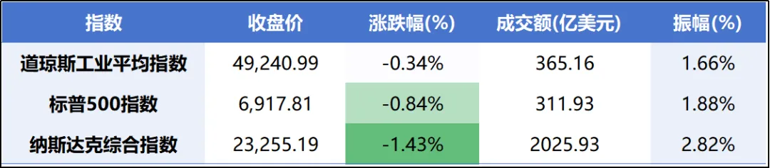 隔夜美股:美股市场三大指数全线收跌,呈现明显的科技股领跌、市场风格切换的特征。市场对人工智能技术替代传统软件行业的担忧引发抛售潮,同时经济数据与货币政策预期也带来压力。尽管指数下跌,但市场内部分化,零售、能源等板块表现强劲。