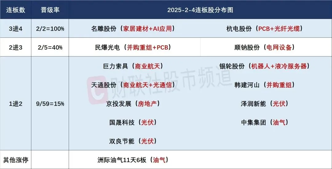 高标股:杭电股份斩获4连板,成为当前市场连板高度标杆,对题材人气有提振作用。