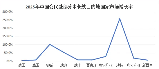 欧洲主要出境游目的地如德国、法国、西班牙、瑞士接待中国游客数量与2024年相比基本持平或有5%左右的小幅上涨。北欧目的地国家包括挪威和瑞典在2025年接待的中国游客数量有较大幅度的增长。大洋洲目的地包括澳大利亚和新西兰在2025年迎来了较多的中国游客,但客流量还未恢复到2019年的水平。