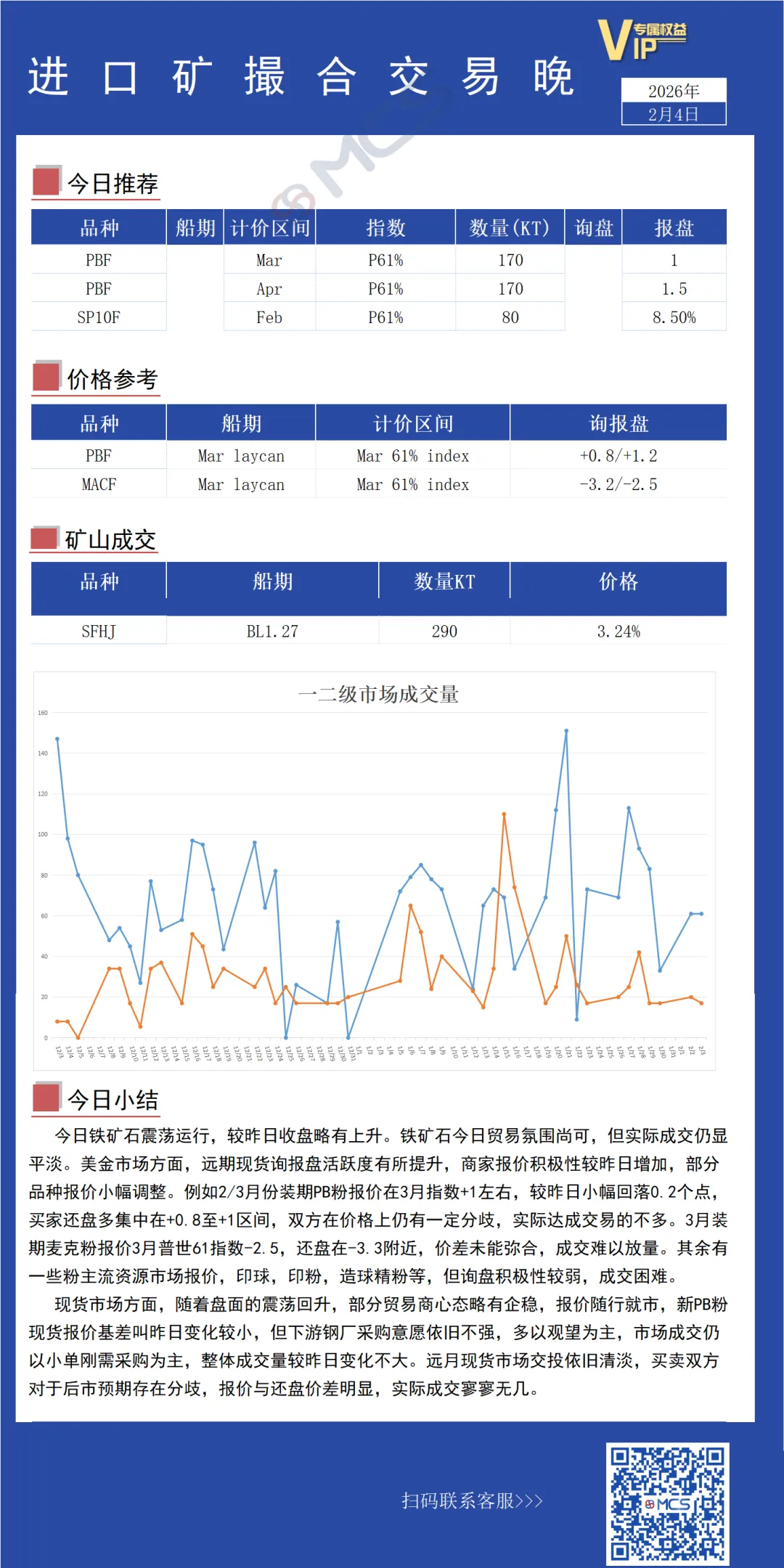 MCS交易中心自2014年成立至今,一直致力于铁矿石实货经纪服务,为客户提供远期现货与港口现货的实货撮合交易。目前,平台拥有10余名资深Broker ,在上海、伦敦、新加坡均设有办事处,平台拥有完整的交易客户管理体系和数据保存系统,可针对客户需要提供专业、高效的交易服务。