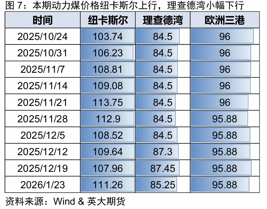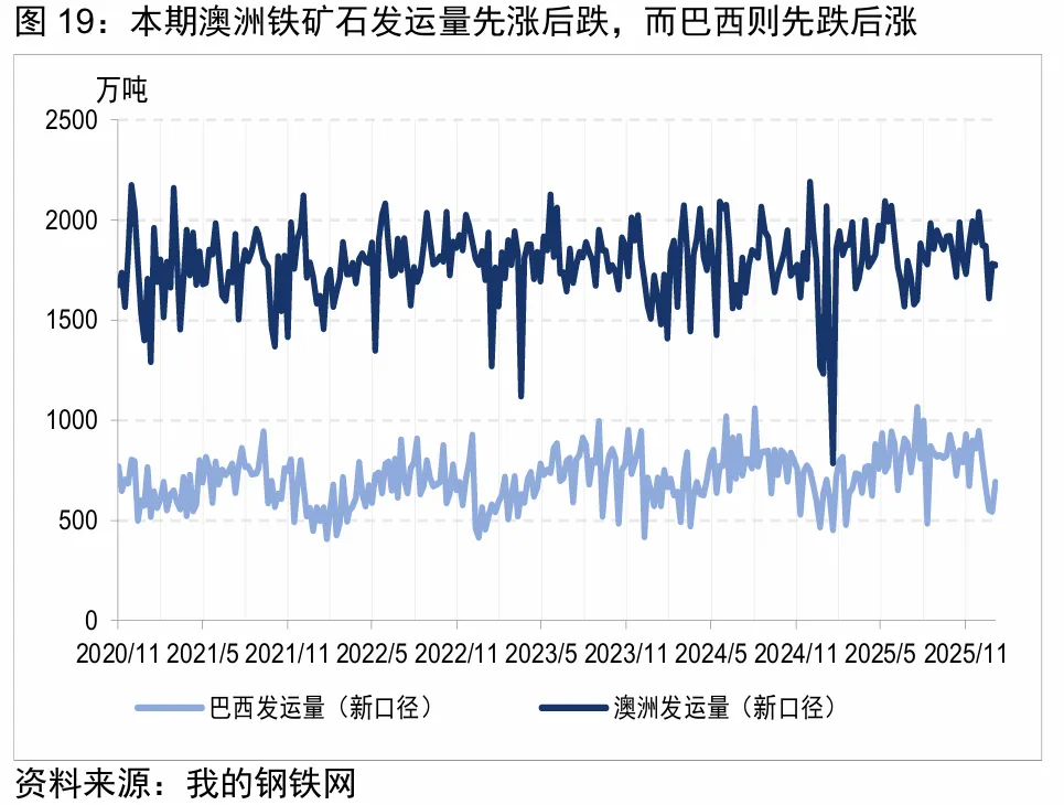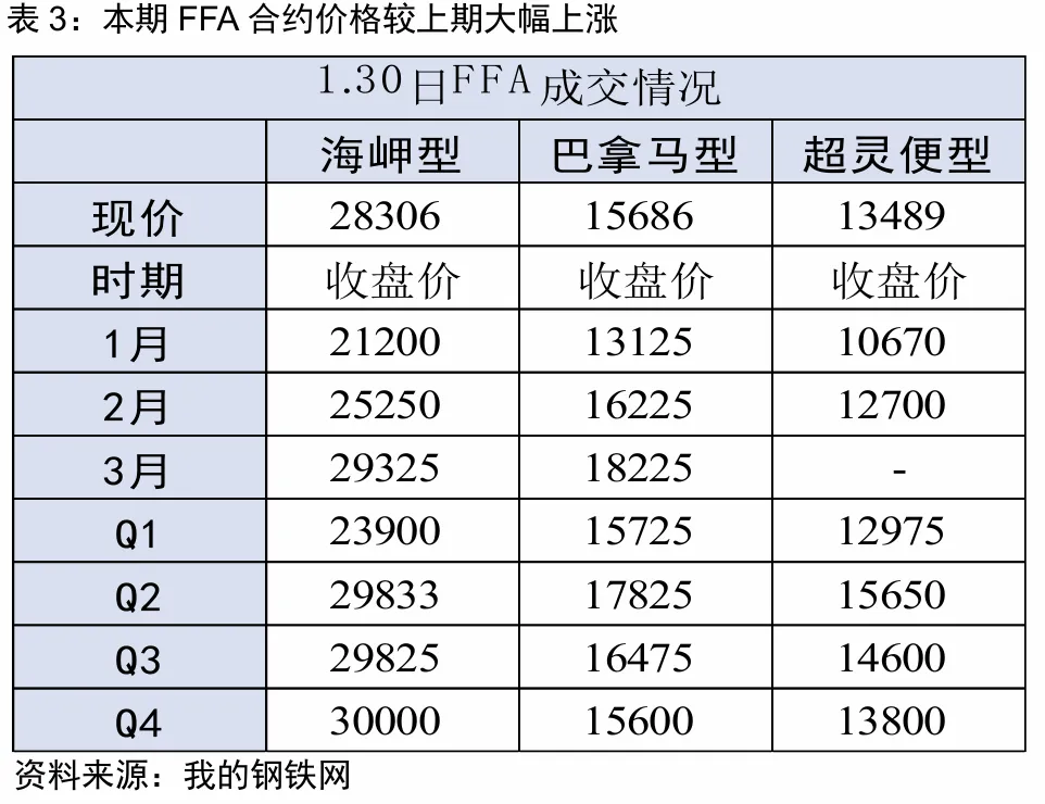 本期市场强势上行,中国国内港口受寒潮天气影响,部分港口周转有所影响,澳洲发运量抬升,巴澳受天气扰动较往年影响小,总体发运量高于往年同期,市场情绪向好,运价和FFA明显上涨。