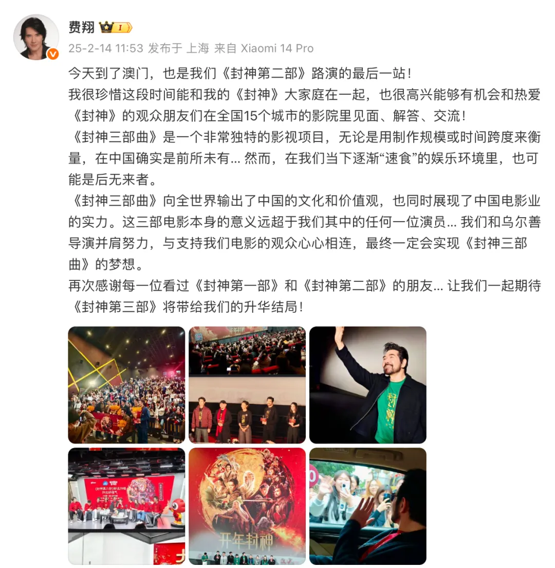 据《2025微博娱乐白皮书》报告显示,在电影领域,2025年度中国电影以不同类型佳作创造了全民热议话题——《哪吒之魔童闹海》重塑了市场对于爆款的认知边界,《封神第二部:战火西岐》以电影视效重述经典神话,《唐探1900》《捕风追影》展现类型的成熟与创新,《南京照相馆》《浪浪山小妖怪》聚焦平民关怀引发全民情绪共振。由乌尔善执导的电影《封神第二部:战火西岐》于2025年1月29日大年初一上映。影片通过宏大场面和精彩特效为观众呈现瑰丽的神话世界,展现中华优秀传统文化之美。作为神话史诗三部曲承上启下之作,《封神第二部:战火西岐》讲述姜子牙与姬发带领西岐军民保卫家园的故事。在视听语言上,《封神第二部:战火西岐》既有峡谷设伏、兵临城下等战争动作场面,也有仙法、神兽助阵等充满奇幻色彩的视觉奇观。2025年微博热议电影角色背后的演员实力派与新生代,多位青年男演员的演绎注重气质契合与角色深度。影片《封神第二部:战火西岐》当中的姬发(于适 饰)也入围2025年微博热议电影男性角色TOP10第8名。另据《2025微博娱乐白皮书》指出,2025年中国电影在宣传营销的线上线下互动玩法上也有不同程度创新。《封神第二部:战火西岐》通过微博网友票选出路演城市,与观众线下零距离互动。在《封神第二部》路演收官站,演员费翔就在微博上向观众影迷们深情告白:“今天到了澳门,也是我们《封神第二部》路演的最后一站!我很珍惜这段时间能和我的《封神》大家庭在一起,也很高兴能够有机会和热爱《封神》的观众朋友们在全国15个城市的影院里见面、解答、交流!”另据《当代电影》发布的《2025年中国电影产业发展分析报告》指出,2025年,中国内地电影总票房达到518.32亿元人民币,同比增加约22%。年度票房再次突破500亿元大关,这一数据低于2017年、2018年、2019年和2023年,位居历年以来的第五位。根据票房统计机构的数据,2025年全球电影票房约为335亿美元,同比上年增加12%。中国内地电影票房以约合74亿美元的成绩位列第二位,仅次于北美地区(包括美国和加拿大)的89亿美元。从全年市场走势来看,2025年中国内地电影市场呈现明显的大起大落态势。在各个档期中,春节档表现突出。这一档期从1月28日开始,持续到2月4日共八天,收获电影票房为95.14亿元,同比增长约18%;观影人次为1.87亿,同比增长约14%,均创造了同档期新的纪录。其中大年初一(1月29日)票房达到18.05亿元,观影人次3515.12万,创造了新的单日票房和观影人次纪录;大年初一到大年初七的单日票房连续7天突破10亿元,刷新中国影史纪录。
