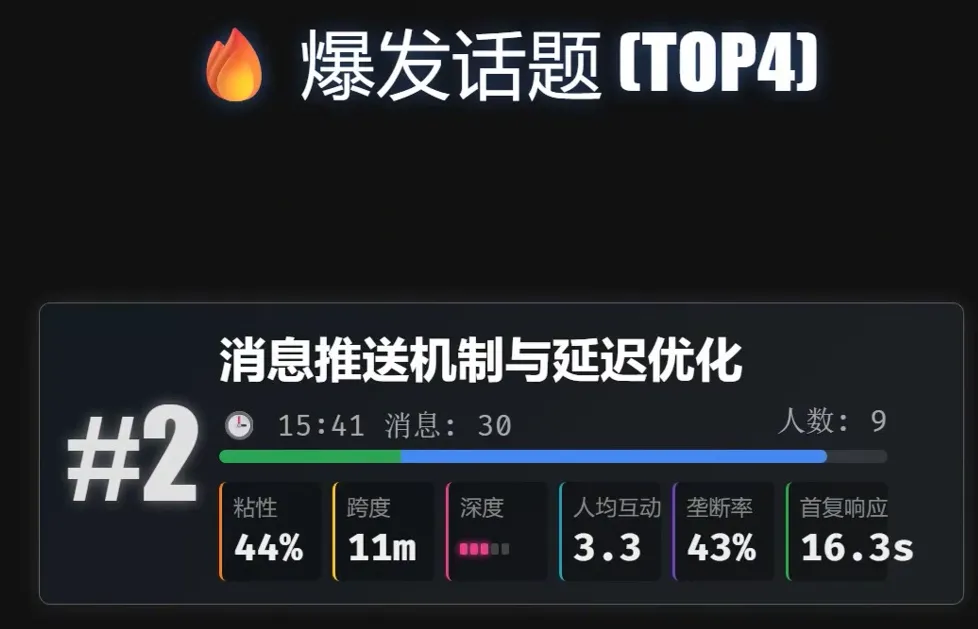 爆发时间:15:41 消息数:30 条 参与人数:9 人 持续时长:11 分钟 首次响应:16.3 秒(极快)?!