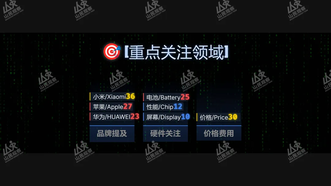 被提及最多的其他品牌:小米 > 苹果 > 华为 硬件关注点:电池 > 性能 > 屏幕 价格敏感度:普遍较高,即使是发烧友也非常看重性价比
