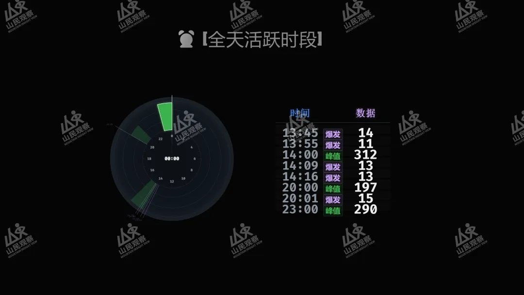 14 点左右:312 条消息(疑似午后摸鱼时段) 20 点左右 23 点左右