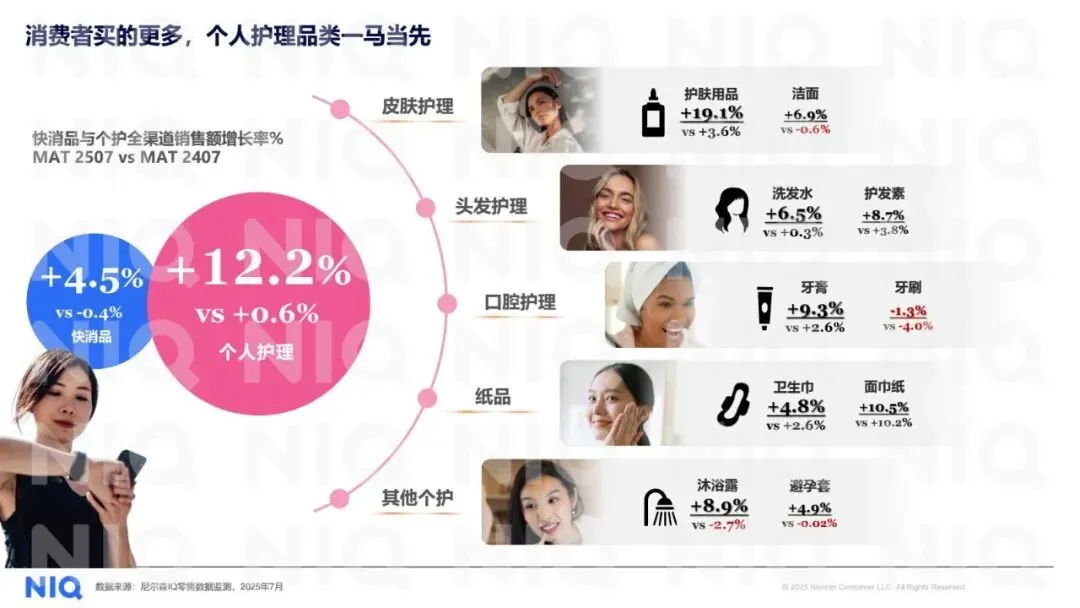 品类表现强劲:个人护理全渠道销售额同比增长4.5%,显著领先于快消品整体水平,其中皮肤护理(+19.1%)、口腔护理(牙膏+9.3%)及纸品(面巾纸+10.5%)成为主要增长引擎。