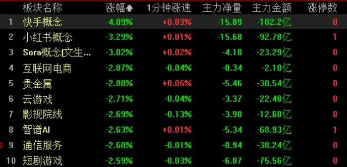三大指数集体低开,创业板指跌幅达1.74%,科创50一度跌超2.4%。AI、算力、半导体等前期热门赛道集体下挫,新易盛、中际旭创跌幅超5%,引力传媒跌停。核心原因是前期获利盘兑现,叠加隔夜美股软件股暴跌的情绪传导,涨跌比逼近1:2,恐慌情绪升温。10:30-11:30:资金抄底,蓝筹股企稳