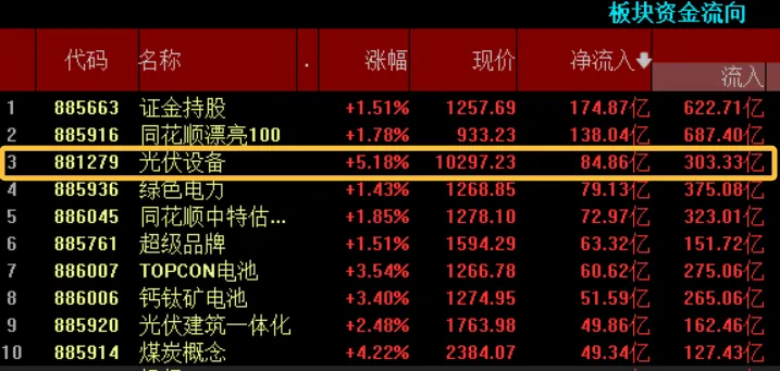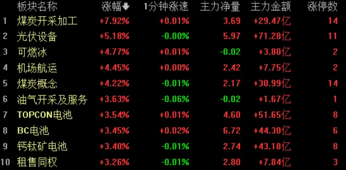 恐慌情绪释放后,资金转向低估值蓝筹股避险。煤炭板块率先爆发,兖矿能源等十余只个股涨停,板块涨幅逼近8%;航空、地产、白酒同步发力,贵州茅台涨超2%重回1500元关口,资金高低切换明显,市场情绪逐步企稳。13:00-14:30:情绪反转,太空光伏领涨