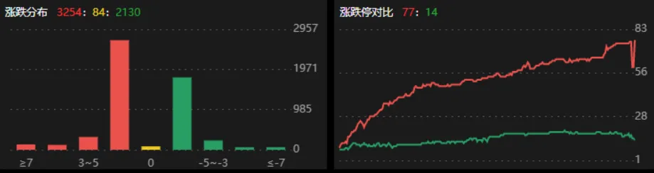 1.涨跌停:77家涨停且封板率偏高,说明资金打板意愿较强;14家跌停集中于高位科技股,未出现大面积跌停,恐慌情绪未扩散。