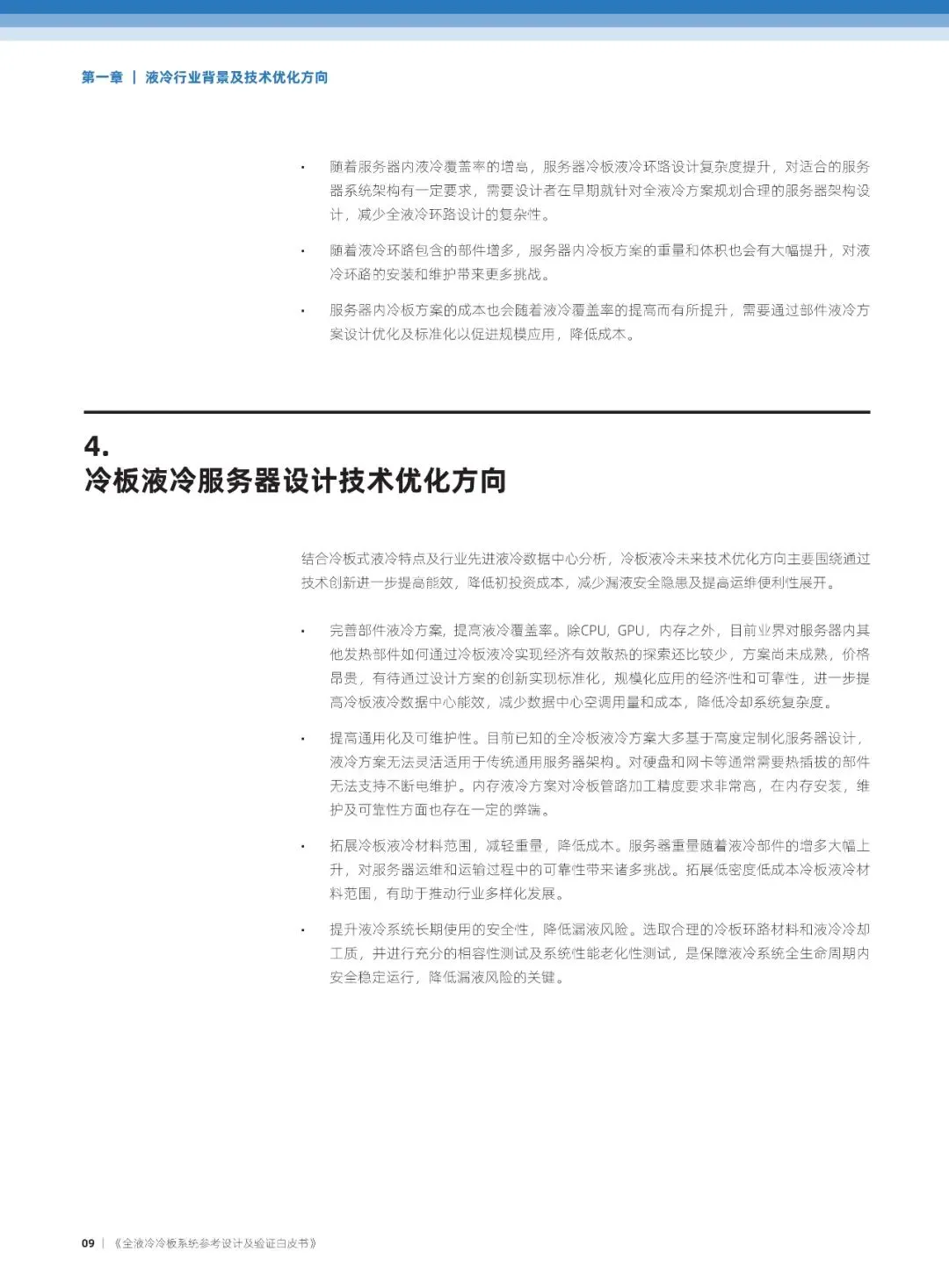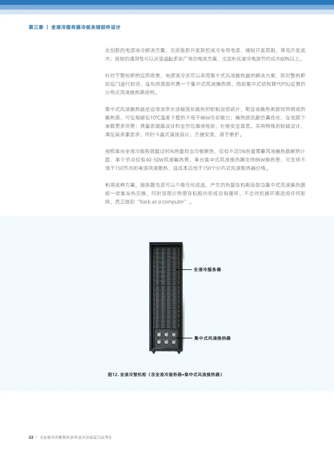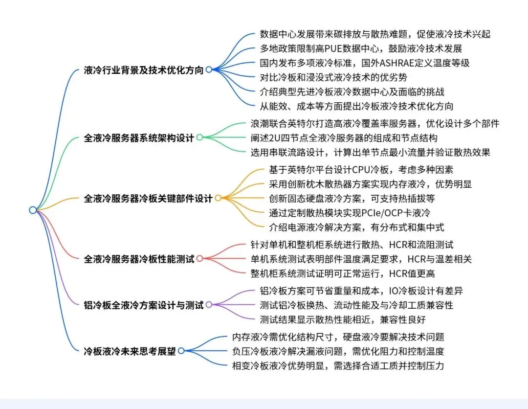 :数据中心行业发展迅速但能耗高,传统风冷受限,液冷技术优势明显,符合 “双碳” 目标。多地政策限制高 PUE 数据中心建设,推动液冷技术发展。国内已发布多项相关标准,国外 ASHRAE 也定义了温度等级。冷板液冷和浸没式液冷是主流技术,冷板液冷有成本等优势,但也存在 PUE 高和漏液风险。先进冷板液冷数据中心有高效节能等优势,但推广面临挑战。冷板液冷未来应提高能效、降低成本、减少漏液隐患和提高运维便利性。 - 全液冷服务器系统架构设计