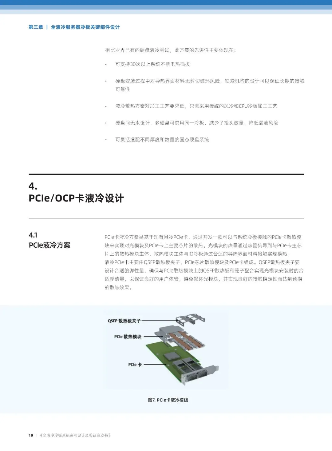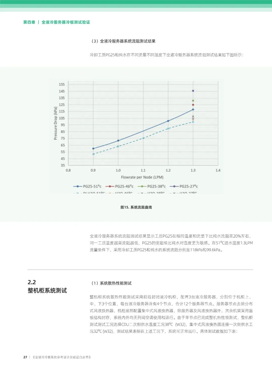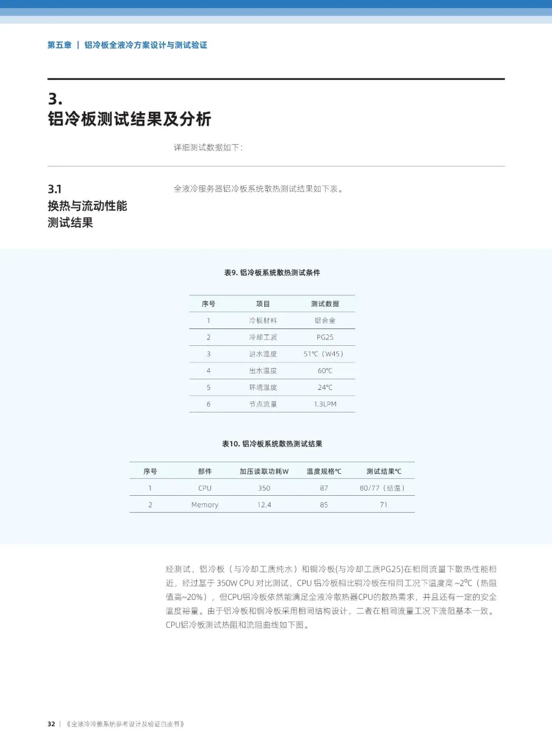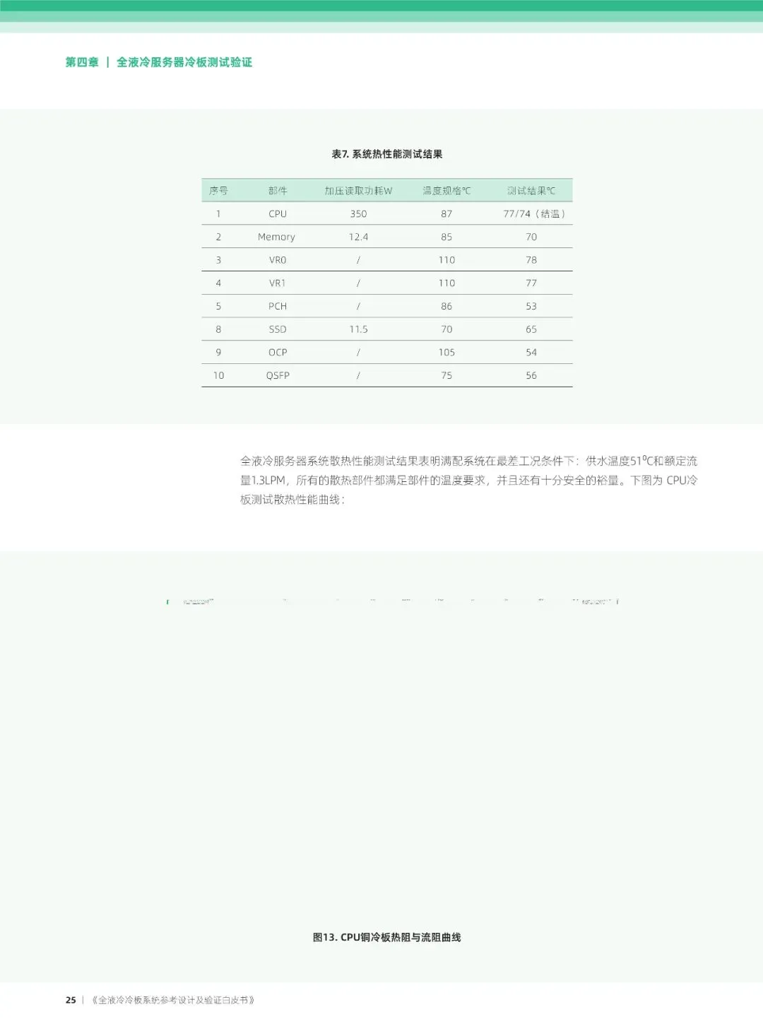 :CPU 冷板基于英特尔平台设计,综合考虑多种因素。内存液冷采用创新枕木散热器液冷方案,具有易维护等优势。硬盘液冷创新方案可支持热插拔,降低漏液风险。PCIe/OCP 卡通过定制散热模块实现液冷。电源液冷有外接风液换热器和集中式风液换热器两种方案,可降低成本。 - 全液冷服务器冷板性能测试