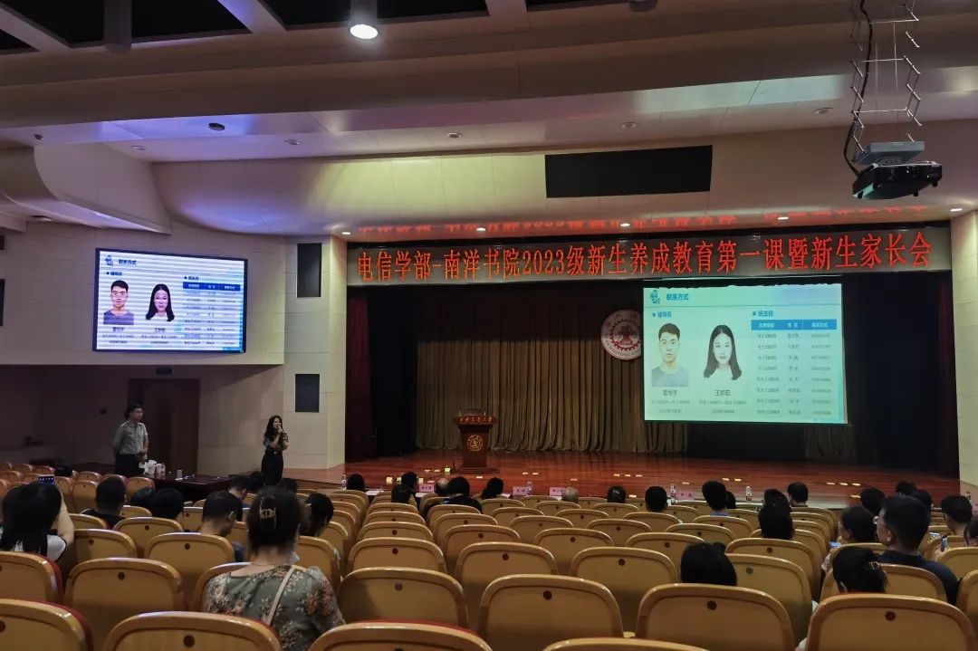 为加强家校互信共通,为学生的未来发展提供坚强的支持,电气学院、电信学部联合南洋书院,分别召开新生家长会。电气学院党委副书记宋杰等领导,电信学部党委书记梁莉等领导,南洋书院院务主任郭小平、副主任顾蓉以及新生班主任、新生辅导员出席会议。家长会主要介绍学科发展情况、专业培养方案以及育人合作模式,并鼓励家长关注学生学业发展、身心健康、日常生活,通过构建“家-校”彼此信任、互相支持的战略合作伙伴关系,积极配合书院学院工作,遇到问题及时沟通,以学生健康学习成长为最终目的,用最温暖的关爱陪伴学生成长,共同为学生发展保驾护航。