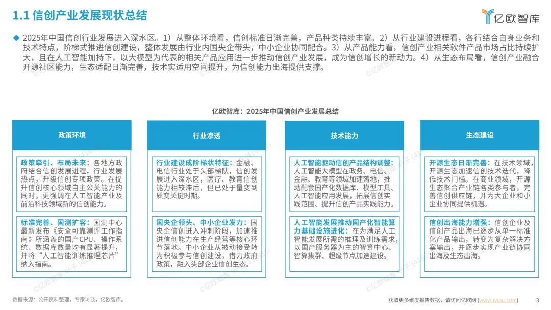 这份《2025信创产业发展趋势及50强报告》由亿欧智库发布,系统梳理了中国信创(信息技术应用创新)产业在2025年的发展现状、技术趋势、行业布局及典型企业案例。以下是对报告核心内容的摘要整理: