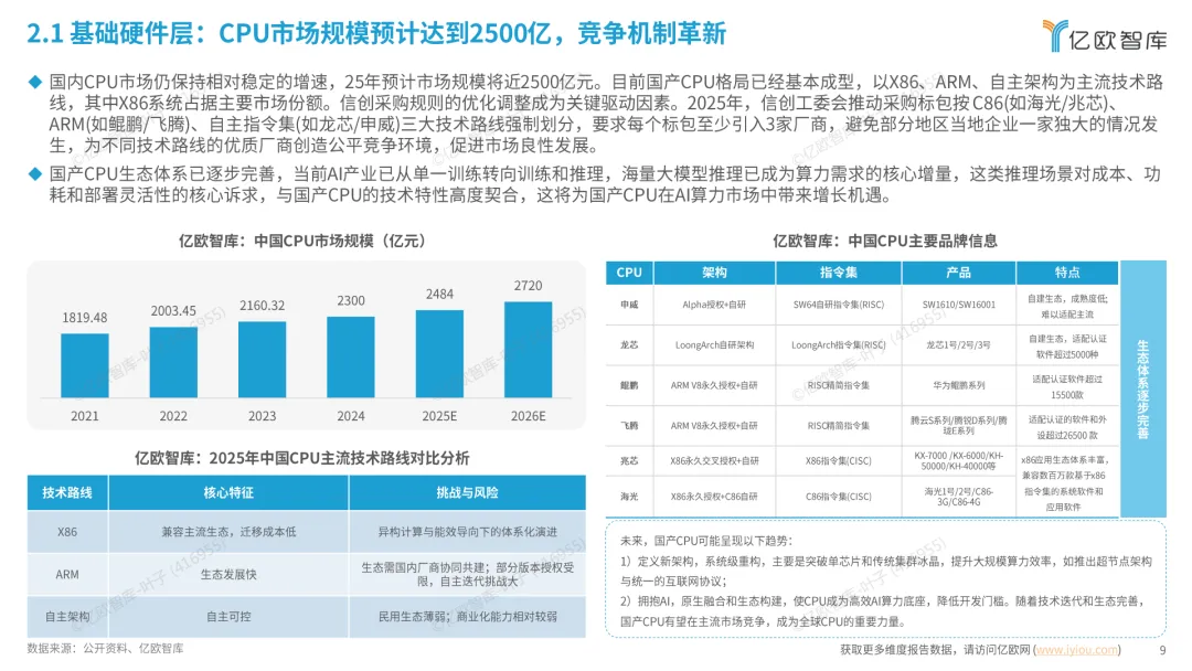CPU市场:2025年预计规模达2500亿元,X86、ARM、自主架构三路线并存,采购机制优化促进公平竞争。