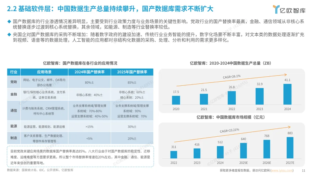 数据库国产化:党政领域替换率最高(85%±),金融、通信从非核心向核心系统过渡。