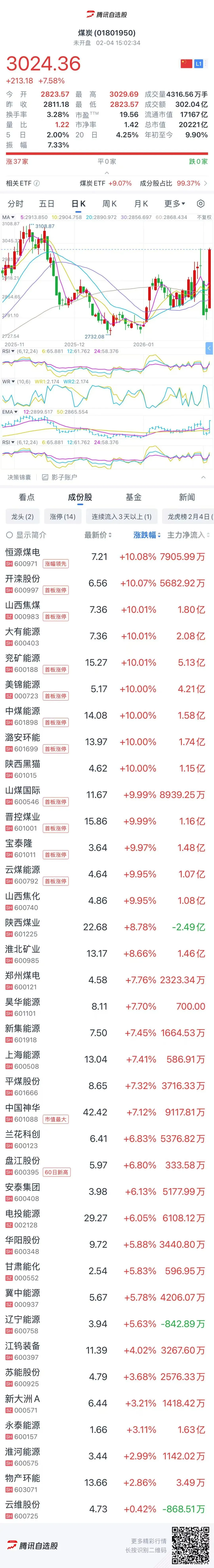 盘面上,煤炭概念掀起涨停潮,陕西黑猫、兖矿能源、中煤能源等十余只成分股涨停。