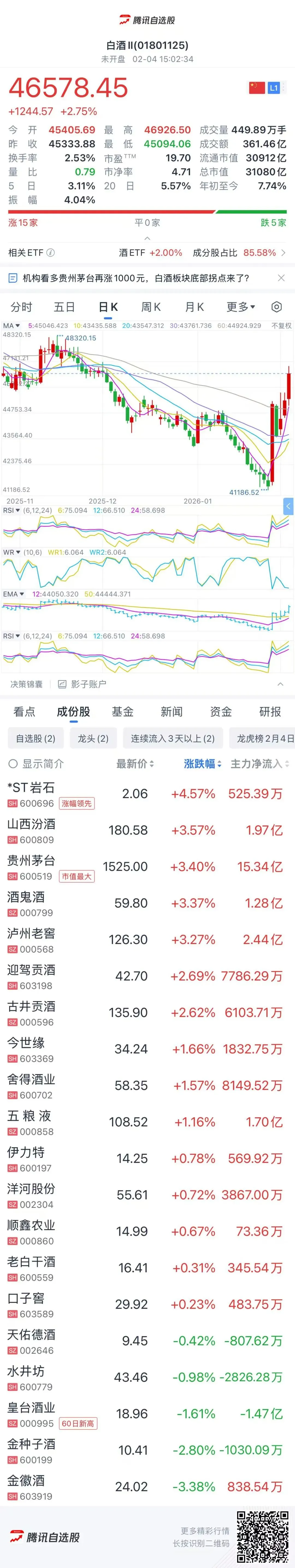2月4日白酒股继续反弹,贵州茅台高开高走,收报1525元,涨3.4%,这是该公司股价自2025年9月15日以来首次重回1500元。