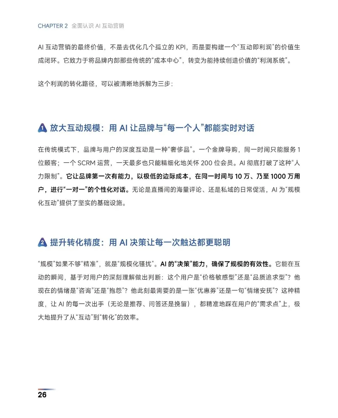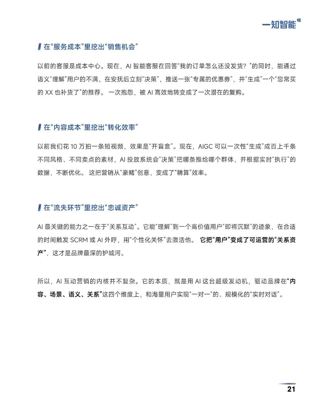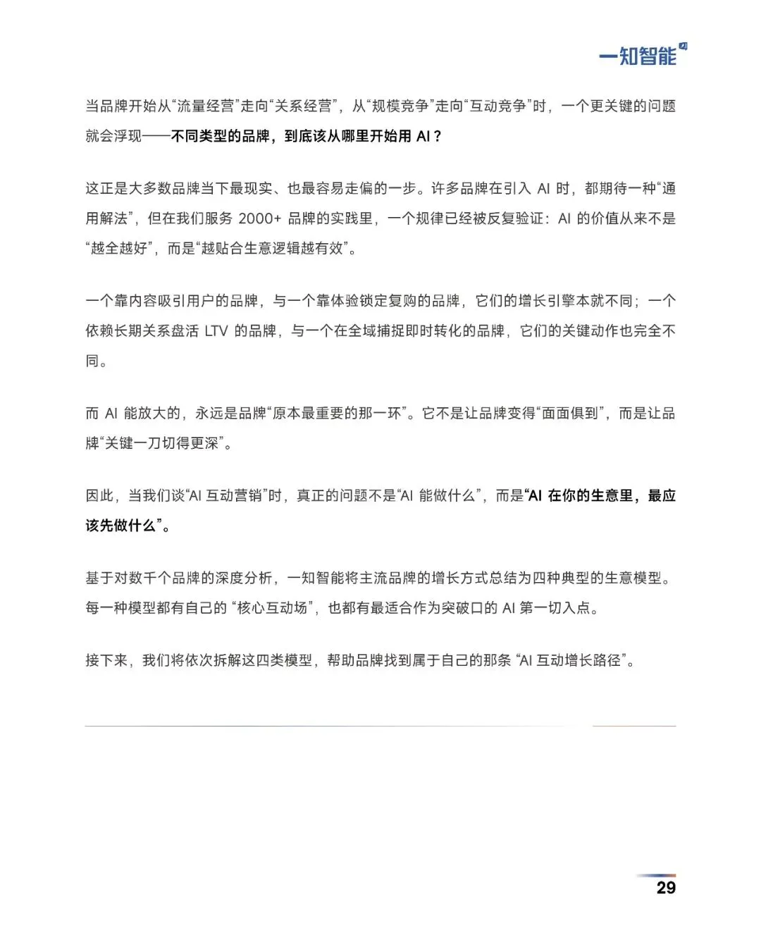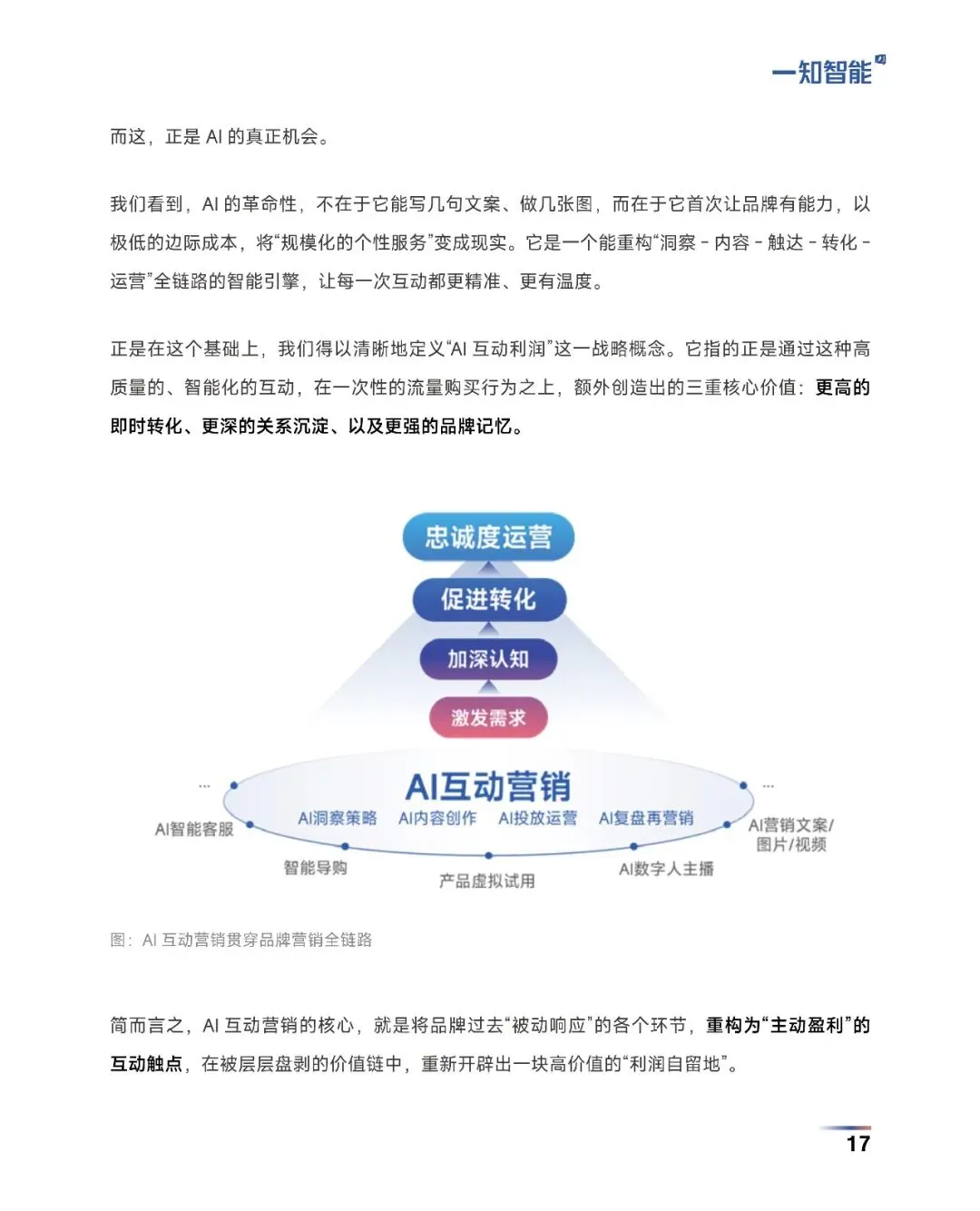 AI互动营销正把“烧钱买流量”变成“对话赚利润”。一知智能提出:用AI引擎在内容、语义、场景、关系四条战线与用户实时“一对一”对话,把客服、内容、投放等传统成本中心变成利润系统。品牌先按自身生意模型选切口,内容型用AIGC量产素材并驱动数字人直播,体验型用大模型外呼精炼线索,关系型以AI私域顾问守护LTV,渠道型借OneID与KOS打通全域。