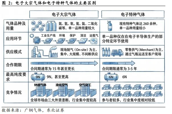 行业具备极高技术门槛,双轨赛道存在明显分层。电子气体作为泛半导体制造领域的关键材料,广泛应用于集成电路、平板显示、LED及光伏等产业链,其中集成电路制造需求占据主要地位。电子气体行业具备极高的技术门槛,常规纯度标准起步于5N(99.999%),先进制程领域更是要求电子气体纯度达到6N(99.9999%)乃至更高,且须对水分、金属离子等杂质实施ppm(10⁻⁶)甚至ppt(10⁻¹²)级别的极限管控,任何细微的纯度偏差均可能导致产品性能失效或整线报废。基于制备与用途的本质区别,行业被划分为电子大宗气体与电子特种气体两大板块,二者在供应模式、合作期限及技术指标上均存在明显的商业逻辑分层。