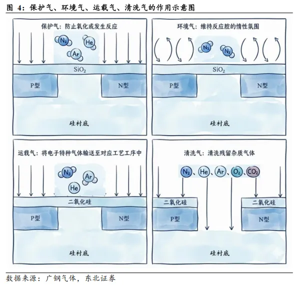 电子大宗气体用途广泛,贯穿泛半导体制造各环节。电子大宗气体覆盖泛半导体制造的各个环节,一般用作保护气、环境气、运载气、清洗气:1)环境气:主要是氮气,用于维持反应腔的惰性氛围稳定;2)保护气:包括氮气、氦气、氩气,主要用于阻隔晶圆加工时的氧化等反应;3)运载气:包括氮气、氦气、氩气等,负责将挥发性化学物质或气体混合物输送至特定工序;4)清洗气:包括氮气、氦气、氩气、氧气、二氧化碳等,主要用于清洗反应后晶圆和器件上残留的杂质气体。