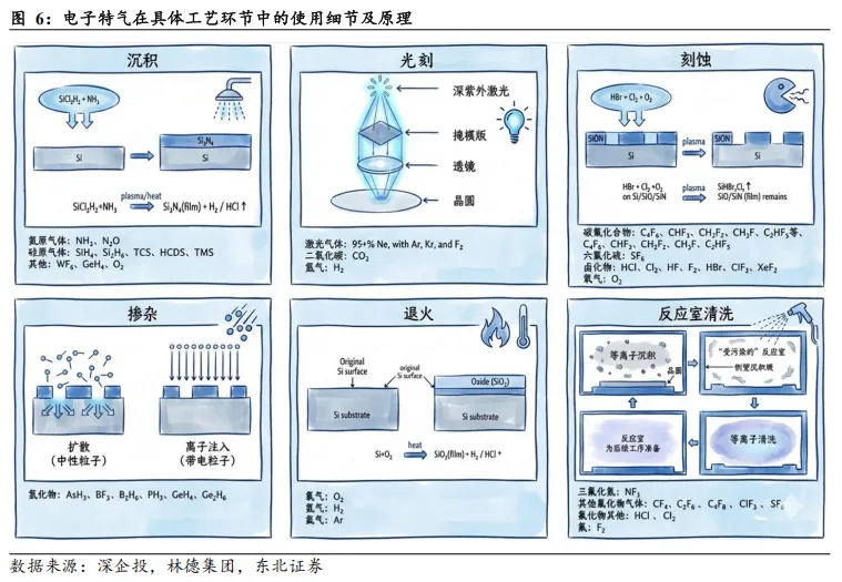 广泛覆盖晶圆制造核心工艺,沉积、蚀刻和清洗环节用量最大。作为芯片生产的基础材料,电子特种气体在半导体制造中广泛应用于蚀刻、清洗、沉积、光刻、掺杂及退火等核心工序环节。其中,沉积、蚀刻和清洗环节的气体消耗量最大,使用气体主要以硅基和卤化物为主;掺杂工艺则依赖于硼、磷或砷等III、V 族气体;光刻工艺所需气体则以稀有气体为主,如氖、氩、氪和氙等,用于产生光刻机所需的深紫外激光光源;退火工艺的气体则用来提供惰性保护气氛或参与化学反应以调控材料特性。