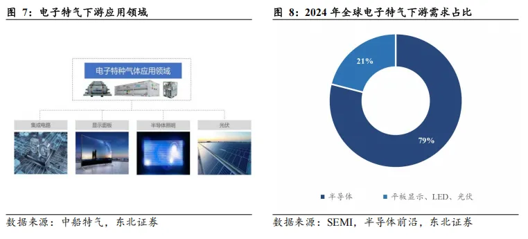 电子特气是半导体关键材料,需求高度集中于集成电路。电子特种气体下游应用包括集成电路、显示面板、半导体照明和光伏等行业:1)集成电路:主要用于成膜、光刻、刻蚀、清洗、离子注入等环节;2)显示面板:主要用于成膜、清洗等环节;3)半导体照明:主要用于外延环节;4)光伏:主要用于沉积、扩散、刻蚀环节。其中,半导体行业作为电子特气最大的应用领域,占据2024年全球电子特气需求的近80%。