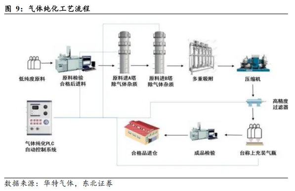 纯度控制提出严苛要求,配方研发构筑技术天堑。电子特气的核心护城河深植于高纯度控制与配方研发两大维度:1)纯度控制体系:厂商必须建立从原料提纯、容器内壁处理至终端配送的全链条闭环管控体系,任何环节的疏漏都可能因“二次污染”导致产品在ppt级精度下失效;2)配方研发:混配工艺要求在超纯单一大气基础上实现多组分的精准计量,通过不同原料组合实现刻蚀、掺杂等特定功能,这不仅考验企业的化学合成能力,更是一场关于全过程防污染与计量精度的技术博弈。
