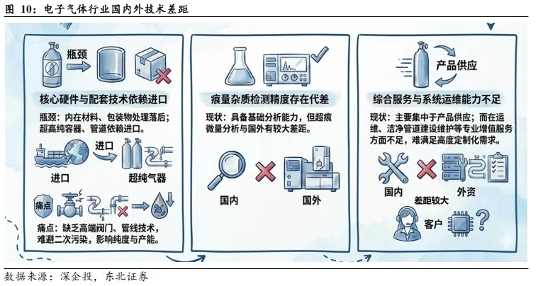核心配套依赖进口,运维服务仍存代差。国内电子气体厂商在产业链深层环节仍面临结构性瓶颈,尤其在容器储运方面,尽管充装与提纯工艺已逐步对标国际,但因包装基础材料及内壁处理技术的积淀薄弱,高端超高纯气瓶与管阀长期受制于海外供应链。相比之下,海外巨头凭借自研的特种阀门与闭环管线技术,有效阻断了气体二次污染风险。此外,在检测与服务维度,本土企业虽已加大针对原料气的分析投入,但在ppt级超痕量杂质的精准捕捉上仍显吃力;同时,随着下游晶圆厂对TGM(全面气体管理)、洁净管道建设及系统运维等定制化增值服务需求的激增,国内厂商在综合解决方案的专业度上与外资头部企业相比尚显单薄。