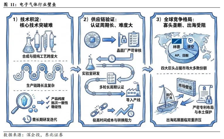 产品认证构筑较高门槛,寡头垄断加剧突围难度。电子气体行业具备显著的准入壁垒,主要体现在:1)技术积淀:不同气体品类的合成与提纯工艺跨度极大,生产链路长且复杂,且下游客户对产品纯度、批次一致性及杂质控制有着近乎苛刻的指标要求,企业需经历长期的研发迭代方能实现核心技术突破;2)供应链验证:半导体供应链具有极强的排他性与验证刚性,晶圆厂对供应商的审核极为严苛,新产品从实验室研发到通过客户多轮长周期认证并导入产线,往往面临极高的时间成本与转换阻力;3)全球竞争格局:全球市场目前呈现高度固化的寡头垄断态势,林德、液空等四大巨头占据市场大多数份额,加之海外成熟市场严密的专利布局与本土保护倾向,国内厂商在出海拓展时面临市场壁垒与知识产权的双重挤压。