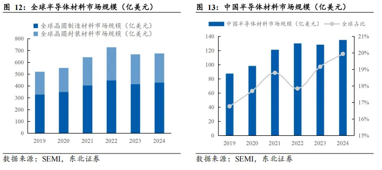 中国半导体材料市场135亿美元,电子特气在晶圆制造材料中占比13%。半导体材料是半导体产业的重要组成部分,主要分为晶圆制造材料和封测材料。据 SEMI,2024年全球半导体材料市场规模达675亿美元,其中晶圆制造材料市场规模429亿美元,晶圆封装材料市场规模246亿美元。分地区看,2024年中国半导体材料市场规模达135亿美元,全球占比19.9%。观察半导体晶圆制造材料市场结构,在全球维度上电子特气占比14%,中国市场中占比13%。