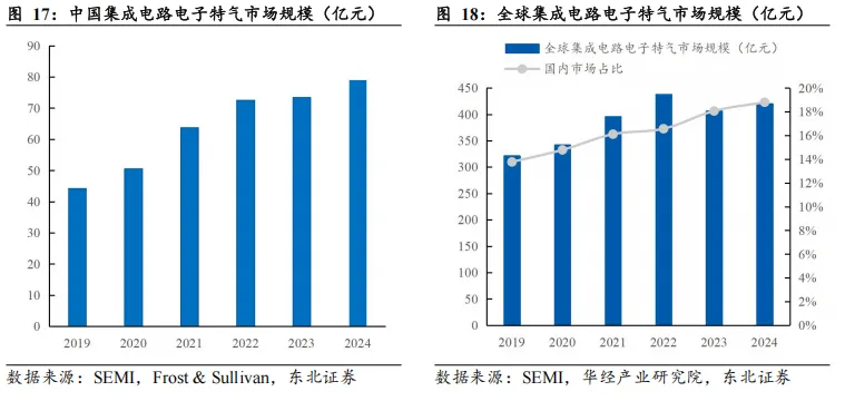 使用半导体材料市场规模数据,按晶圆制造材料占比对集成电路电子特气市场规模进行测算,预计2024年中国集成电路电子特气市场规模达79亿元,全球占比18.8%。