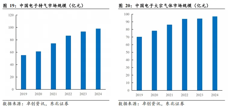 同时,结合电子特气下游需求占比,并参考卓创资讯历史数据,预计2024年中国电子特气市场规模为98亿元,电子大宗气体市场规模为97亿元。