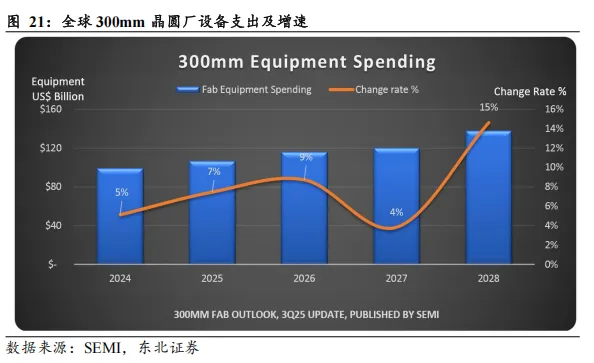 全球晶圆扩产预期明确,中国设备支出全球领先。据SEMI数据,随着晶圆厂区域化趋势加剧以及对数据中心和边缘设备中AI芯片需求的激增,预计从2026年到2028年全球300mm晶圆厂设备支出将达到3740亿美元。分区域看,中国大陆预计受益于国家政策的持续推动,将继续领先全球300mm设备支出,2026至2028年间投资总额将达940亿美元。