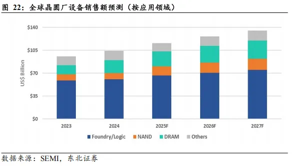 先进制程韧性依旧,存储扩产强势领跑。全球晶圆制造设备(WFE)市场正迎来结构性复苏,其中Foundry/Logic展现出极强的投资韧性,受益于先进制程的持续演进,2025年相关设备销售额预计同比增长9.8%至666亿美元,并有望在随后的两年保持稳健增长态势,于2027年突破750亿美元大关。相比之下,存储板块的资本开支弹性更为显著:NAND领域在3D堆叠技术迭代与主流产能扩张的共振下,2025年相关设备市场规模预计大幅激增45.4%至140亿美元,2026、2027年分别再增12.7%和7.3%;DRAM赛道则在AI算力爆发与数据中心需求的强力驱动下,加速向HBM产能扩充及制程升级倾斜,预计2025年相关设备销售额同比增长15.4%至225亿美元,2026、2027年分别再增长15.1%和7.8%,引领新一轮行业上行周期。