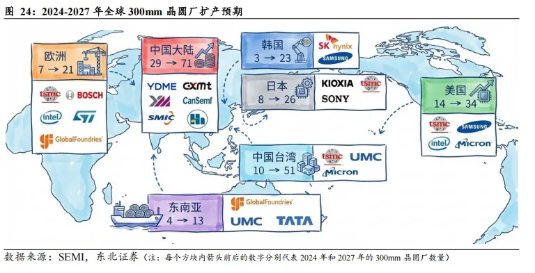 中国本土晶圆厂持续扩产,设备&材料国产替代加速。在“十四五”规划、国家大基金二期等政策与资金的大力支持下,中国本土晶圆厂持续扩产,据SEMI预测,中国大陆300mm晶圆厂数量将从2024年的29座激增至2027年的71座,或产生巨大的半导体设备及材料采购需求,为国产设备和材料提供大量验证机会和替代窗口。据观研天下,国内主流晶圆厂如中芯国际、华虹集团、合肥晶合集成、长江存储及长鑫科技均有相应扩产计划。