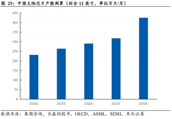投片规模稳步抬升,先进制程持续扩容。据ASML数据,全球晶圆制造需求将维持确定性的结构性增长态势,预计全行业月产能将从2025年的1120万片稳步攀升至2030年的1510万片(等效12英寸),期间年均新增月产能约为78万片。从细分赛道驱动力来看,逻辑芯片承担主要扩产重任,其中7nm及以下先进制程虽基数较小,但受益于高性能计算需求,预计将保持每年新增约20万片/年的扩容节奏。此外,DRAM受AI服务器及HBM需求拉动,预计年均扩产约16万片,NAND市场预计年均扩产约4万片/年,行业资本开支正加速向逻辑芯片与高端存储领域倾斜。