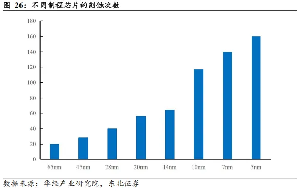 制程迭代推高刻蚀频次,工艺演进拉动特气放量。随着晶圆制造工艺从成熟节点向先进制程迭代,刻蚀步骤呈现出陡峭的增长态势:65nm制程仅需约20次刻蚀,而演进至14nm及更先进的7nm、5nm节点时,受多重曝光(Multi-Patterning)技术引入及晶体管架构立体化(FinFET)的影响,刻蚀次数分别飙升至64次、140次及160次,相比成熟制程实现倍数级的增长。这种工艺复杂度的几何级跃升直接重塑了上游材料的需求模型,意味着每一道新增的纵向刻蚀工序都将刚性传导为对高纯氟碳类等电子特气的消耗需求,先进制程产能的扩充势必成为驱动特气市场规模非线性扩张的核心引擎。